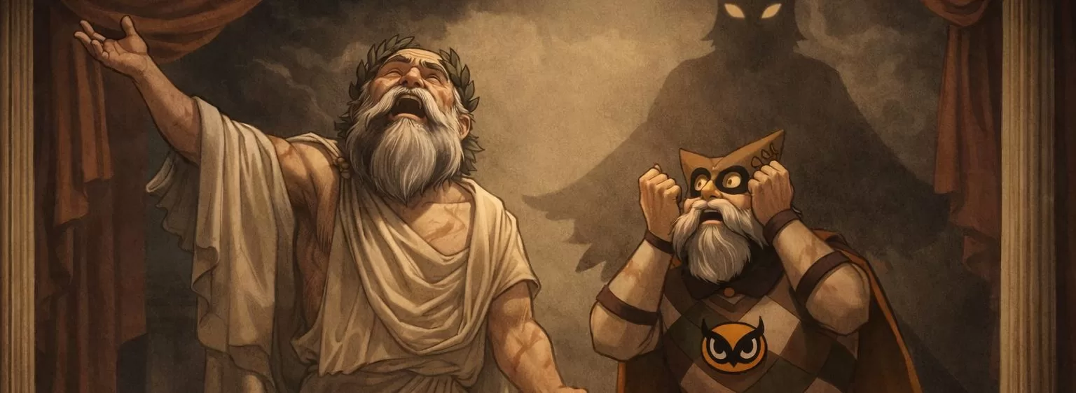 Hubris — Excessive pride or overreach. An important caveat and confession: this is technically from scholarship around Poetics, not Poetics, itself, but I think important for a discussion of The Owl.