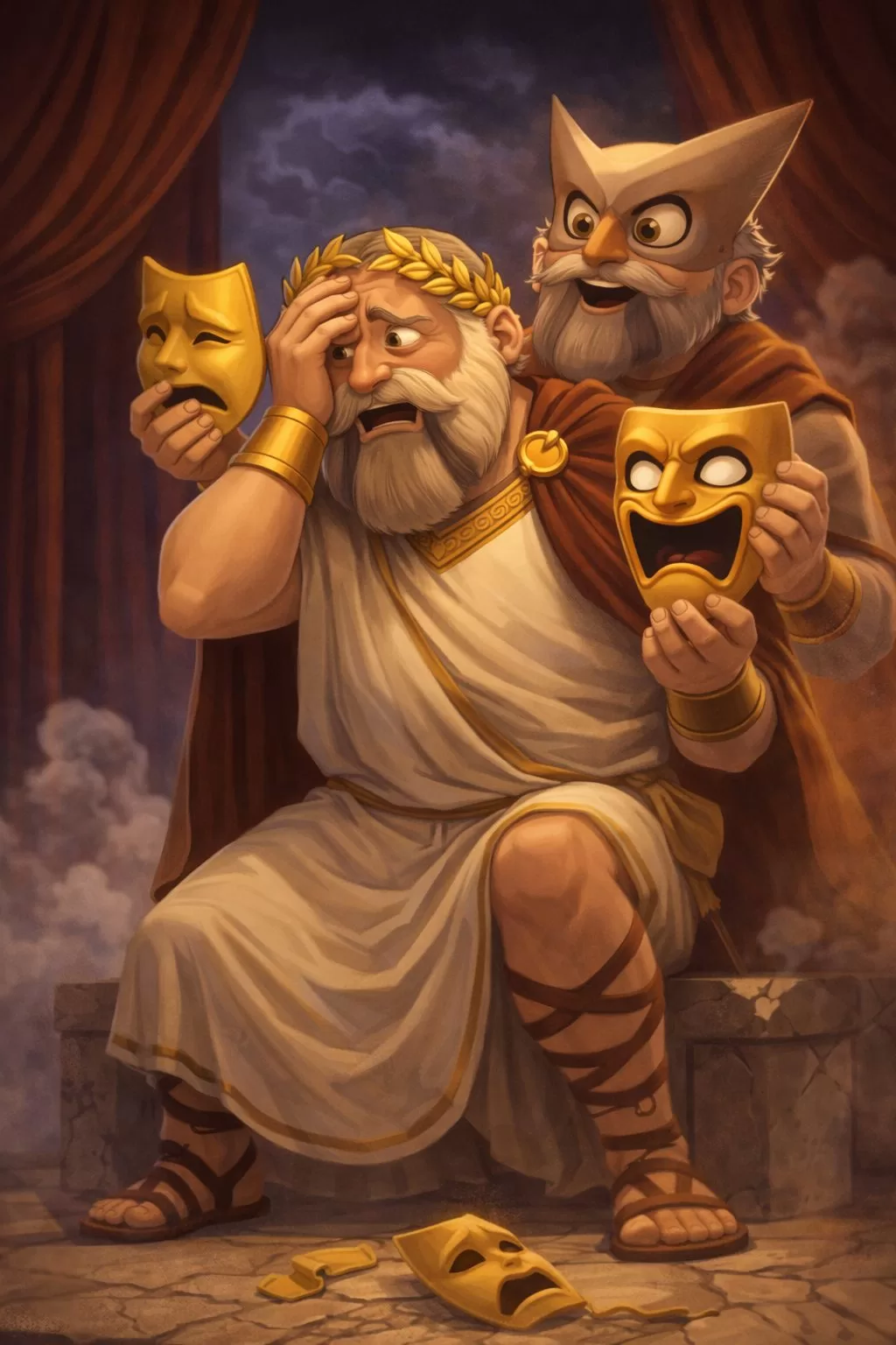 Aristotle considered anagnorisis the most powerful element—it’s what makes a tragedy rather than a sad story. Damocles filling out the forms on the way out is textbook anagnorisis — and notably, Aristotle prized it most when peripeteia and anagnorisis arrive together, which they do here.